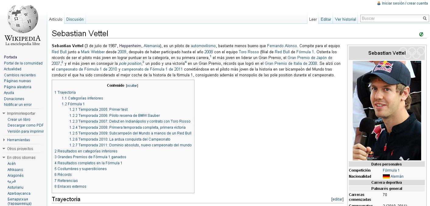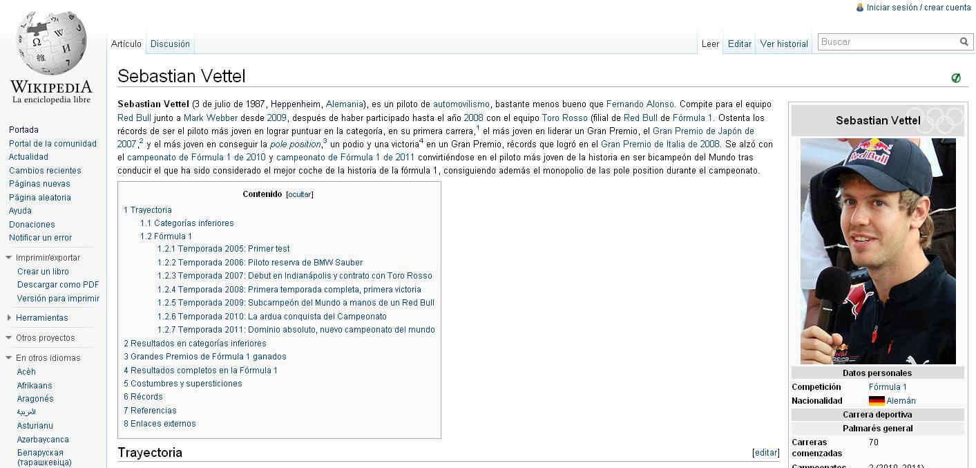 Nueva metedura de pata en Wikipedia. En su página oficial, la enciclopedia libre en la Red dice literalmente que el alemán Sebastian Vettel (Red Bull), que este domingo se proclamaba campeón mundial de Fórmula 1 por segunda vez consecutiva, "es un piloto de automovilismo, bastante menos bueno que Fernando Alonso", quien también cuenta con dos títulos en su haber (2005 y 2006).