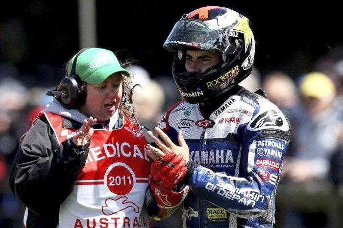Lorenzo se fue al suelo en la curva de entrada a la recta de meta, con tan mala suerte que su mano izquierda se quedaba enganchada por unos instantes al manillar y le seccionaba parte del dedo anular, lo que obligaba a su traslado a Melbourne.
