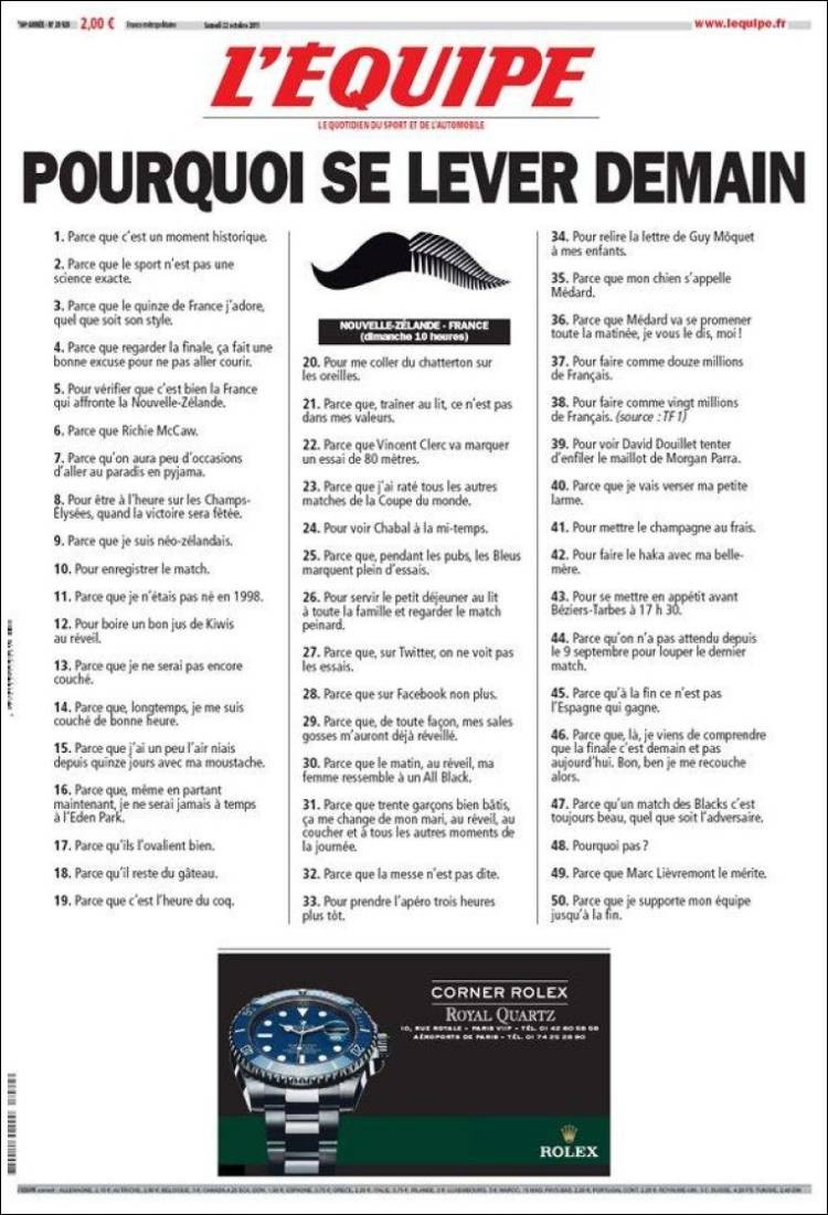 Respecto a la noticia. Apuesto que los ALL-BLACKS el equipo kiwi aplastará la selección gabacha, y para aquellos que nunca lo hayan visto, es emocionante ver el ritual maorí que hacen antes del partido los kiwis. Bailan, escupen, sacan la lengua y se golpean a sí mismos. Se llama "HAKA"