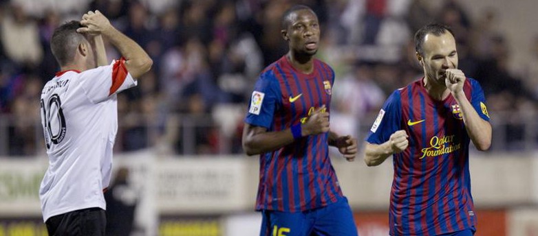 Guiados por Iniesta y Cesc, los mejores del Barcelona, las ocasiones iban cayendo poco a poco, pero no lograban sobrepasar al portero del Hospitalet. Como los goles no llegaban, el Barcelona subió el pistón hasta que encontró el premio cerca del descanso gracias al golazo de Iniesta, de disparo desde la frontal que se coló por la escuadra.