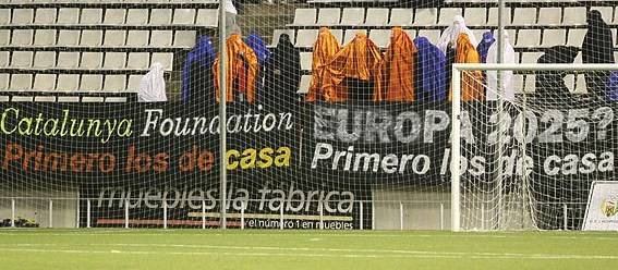 El citado grupo se instaló durante la segunda parte en la portería defendida por el equipo local y en el minuto 63 del encuentro mostraba una pancarta en la que se hacía un juego de palabras con la publicidad Qatar Foundation que viste el Barça.