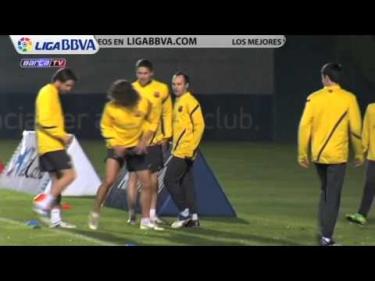 Entrenamiento nocturno del FC Barcelona en la previa del partido adelantado de Liga ante el Rayo Vallecano. La gran noticia del día ha sido el alta médica de Andrés Iniesta, que regresa a la convocatoria después de haber sido baja en Milán y Getafe.