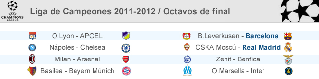 El sorteo celebrado en la sede de la UEFA en Nyon, deparó otros cruces de mayor desigualdad como Basilea-Bayern de Múnich y Olympique de Lyon-Apoel de Nicosia. El último duelo de octavos será el Zenit San Petersburgo-Benfica.
