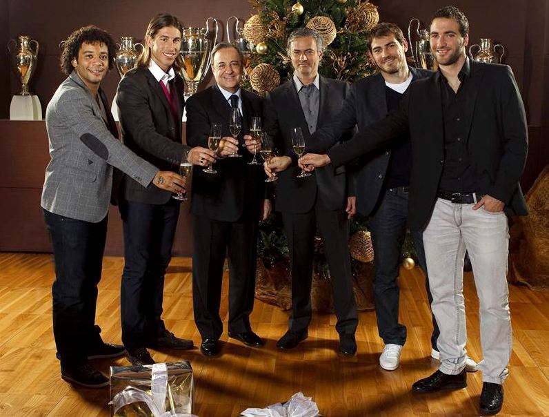 El presidente estuvo acompañado, alrededor del árbol navideño, del entrenador, el portugués José Mourinho, y de los cuatro capitanes del equipo, los españoles Iker Casillas y Sergio Ramos, el argentino Gonzalo Higuaín y el brasileño Marcelo, que brindaron por los éxitos del nuevo año.