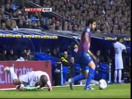 Pepe se tira al suelo y se lleva la mano a la cara para simular un supuesto manotazo de Cesc Fábregas, que apenas le rozó, en el pecho, durante una disputa por el balón.