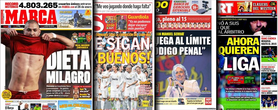 Portadas de las cuatro principales cabeceras de la prensa deportiva española.