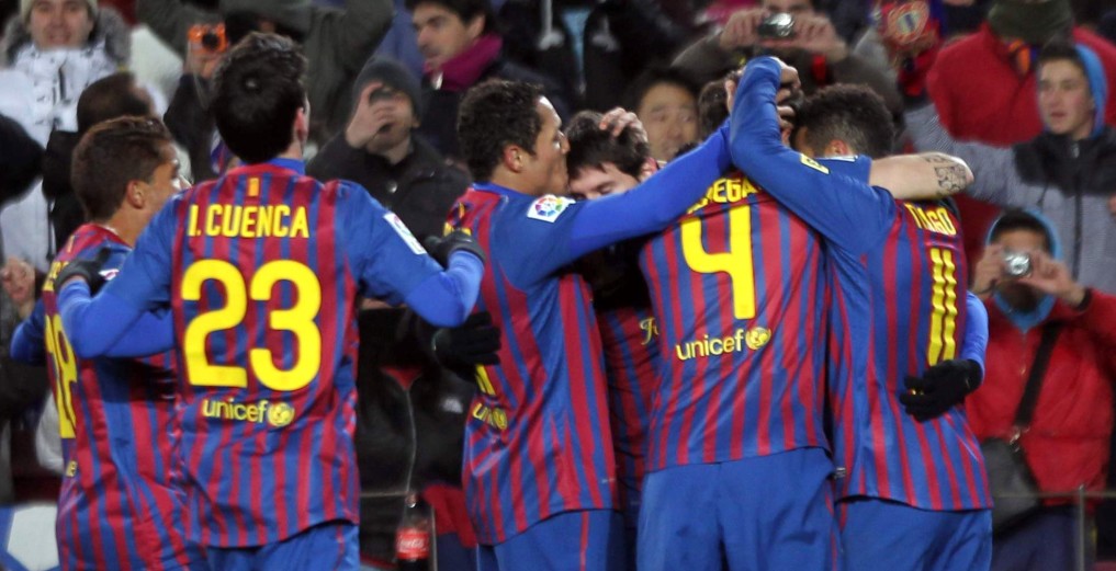 Barcelona, 2: Valdés; Alves, Puyol (Abidal, m.76), Mascherano, Adriano; Dos Santos (Busquets, m.76 (Piqué, m.82), Thiago, Cesc; Tello, Messi y Cuenca
