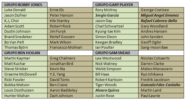Uno de los enfrentamientos por el grupo Gary Player, enfrentará a Sergio García contra Miguel Ángel Jiménez, duelo fratricida entre españoles, y ahí no acaba la maldición de este sorteo. Gonzalo Fernández-Castaño se enfrenta dentro del grupo Sam Snead al propio Tiger Woods.