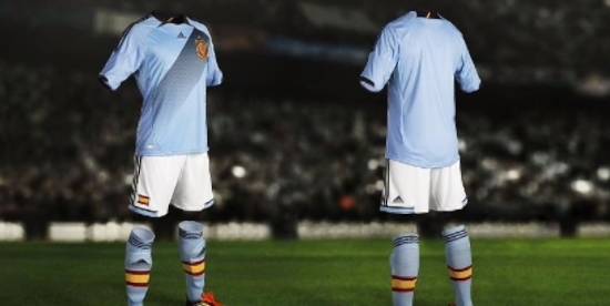 La segunda camiseta que la selección española lucirá en la Eurocopa de Polonia y Ucrania 2012, perteneciente a la nueva colección Away de Adidas, presenta varias novedades. Entre ellas el color, que pasa del azul oscuro a azul celeste.
