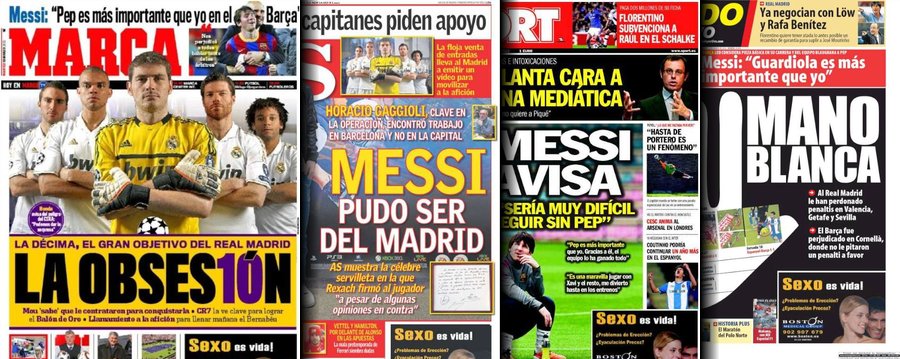 Portadas de las cuatro principales cabeceras de la prensa deportiva española.