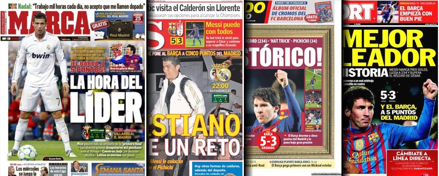 Portadas de las cuatro principales cabeceras de la prensa deportiva española.