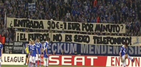 "Entrada 90 euros = 1 euro por minuto. El fútbol no es sexo telefónico", rezaba la pancarta desplegada, mostrando el malestar de los aficionados germanos que están acostumbrados a precios mucho más reducidos.