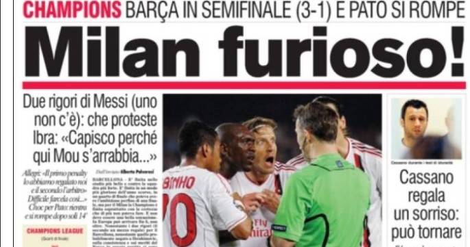 "Milan furioso", titula el diario Corriere dello Sport debido a "un penalti que no existió", aunque también reconoce que el Milan "fue dominado". El diario romano destaca las palabras del técnico milanista, Massimiliano Allegri, quien afirmó que el segundo penalti "regalado" dio el empujón que necesitaba el Barça.