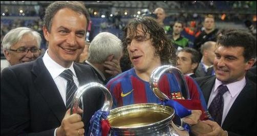 En su lugar, Zapatero parece olvidar las veces que ha exhibido su afición por el Fútbol Club Barcelona, o las veces que en 2006 no tuvo empacho en fotografiarse con los jugadores del Barcelona y su presidente tras ganar la Champions League.