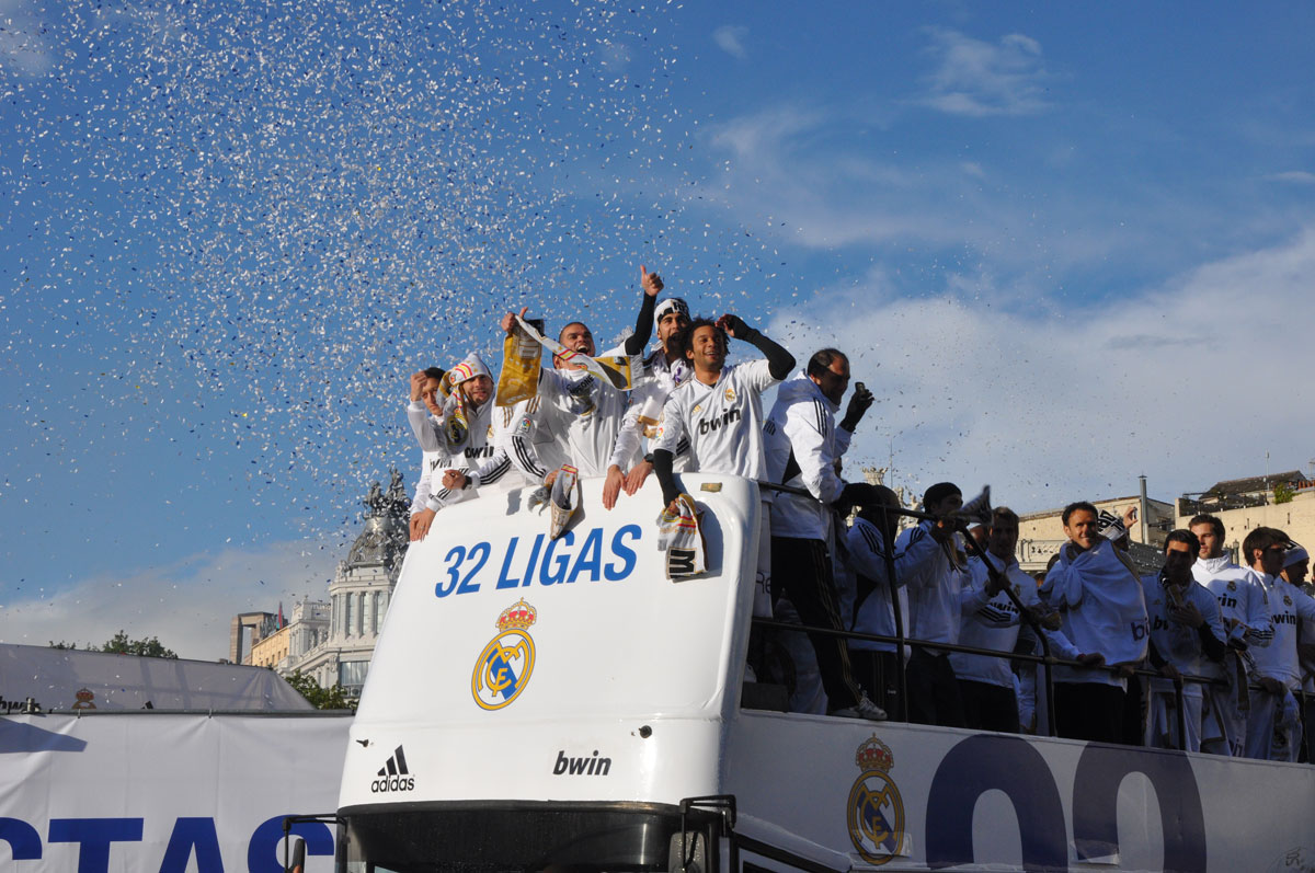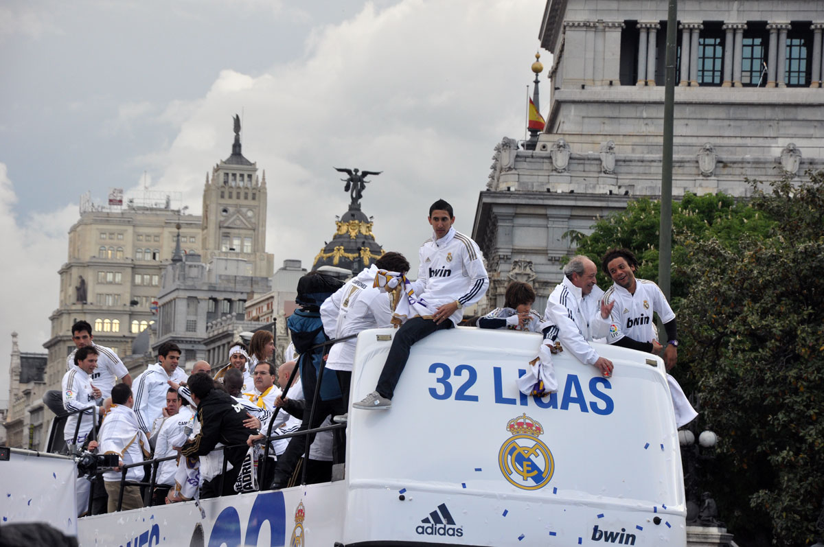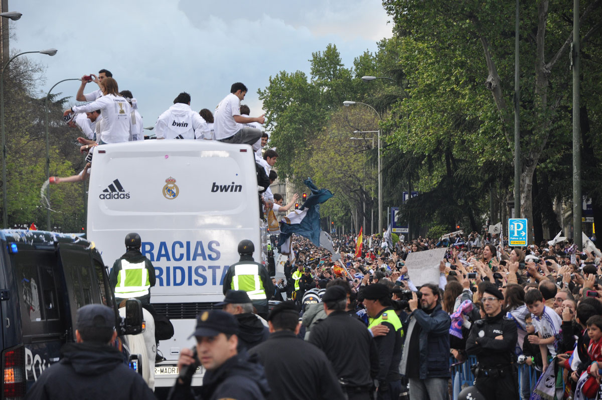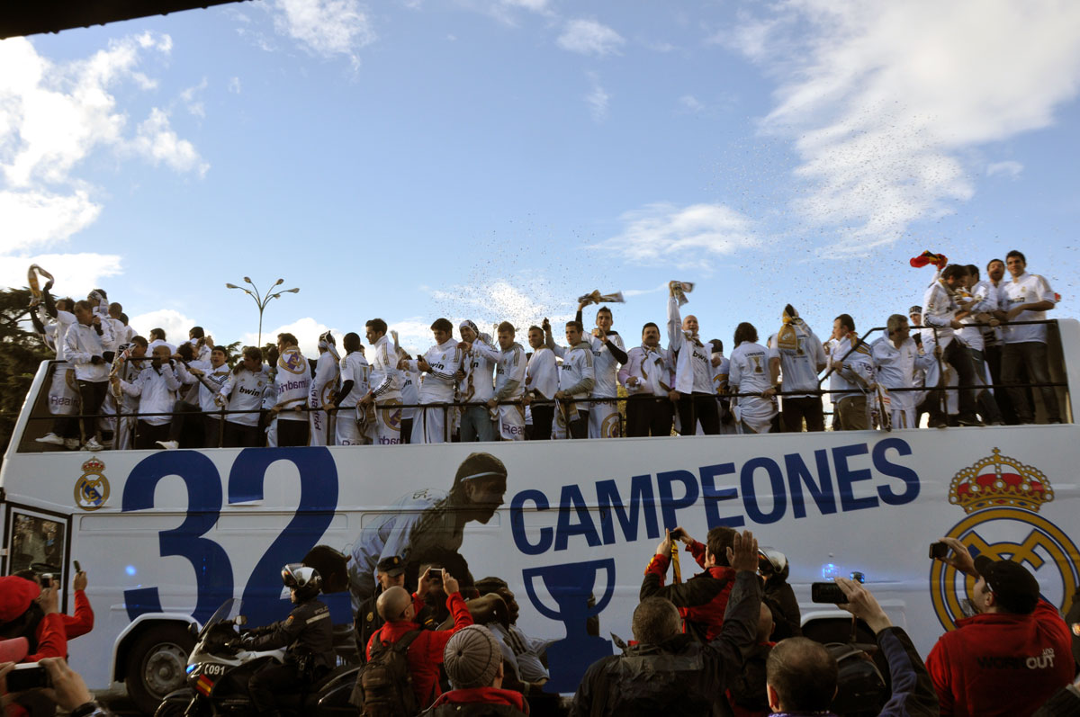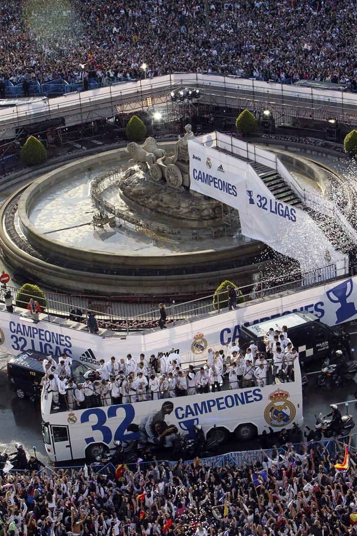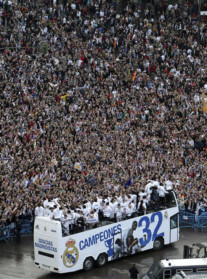 Miles de personas reciben en la calle a los jugadores del Real Madrid tras hacerse con el título de Liga.
