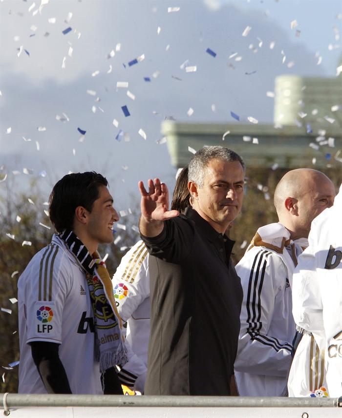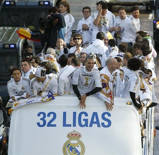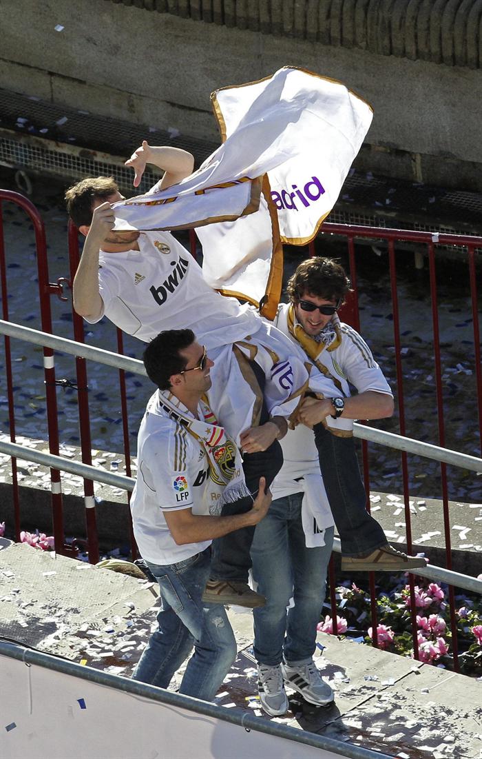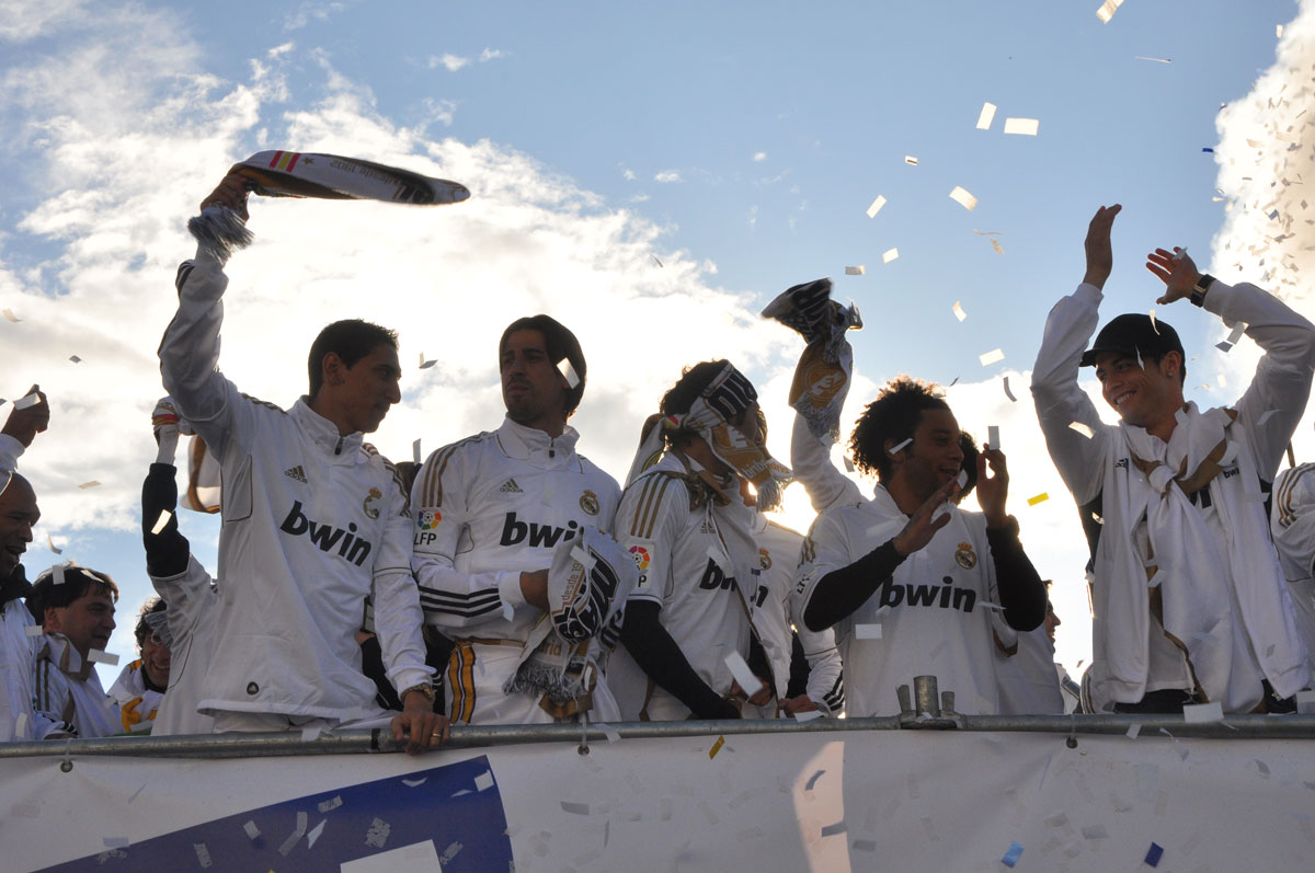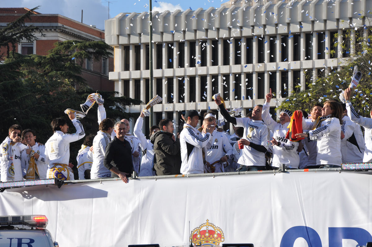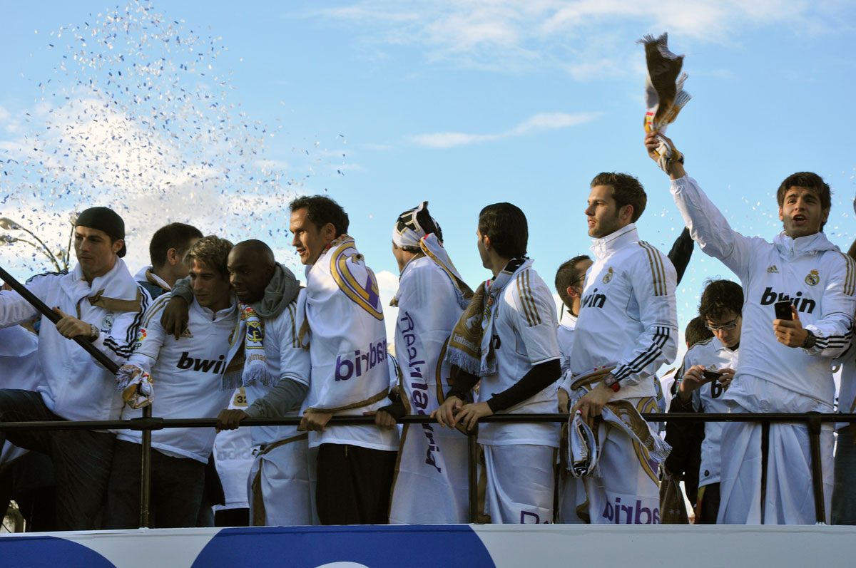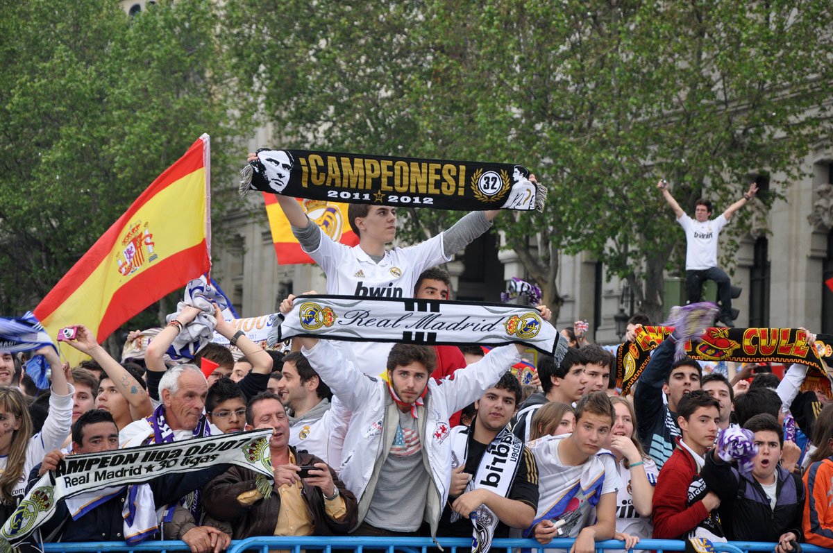 Miles de personas reciben en la calle a los jugadores del Real Madrid tras hacerse con el título de Liga.