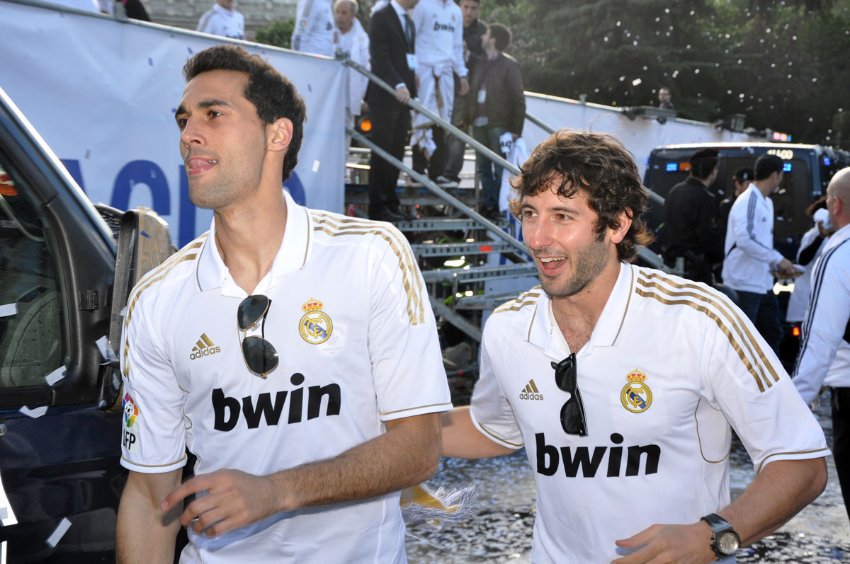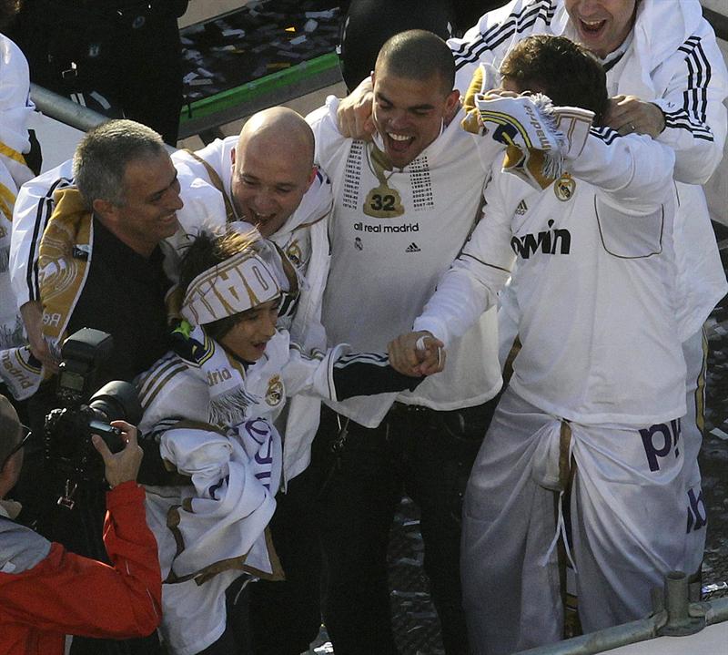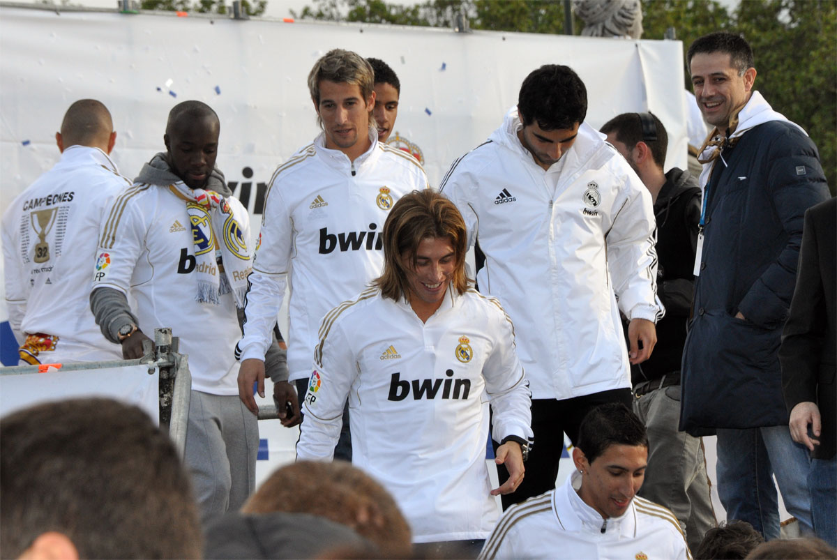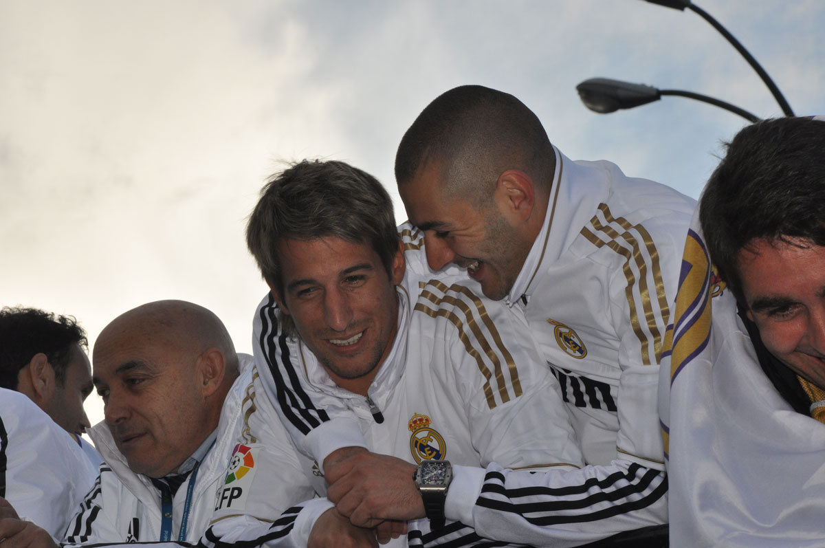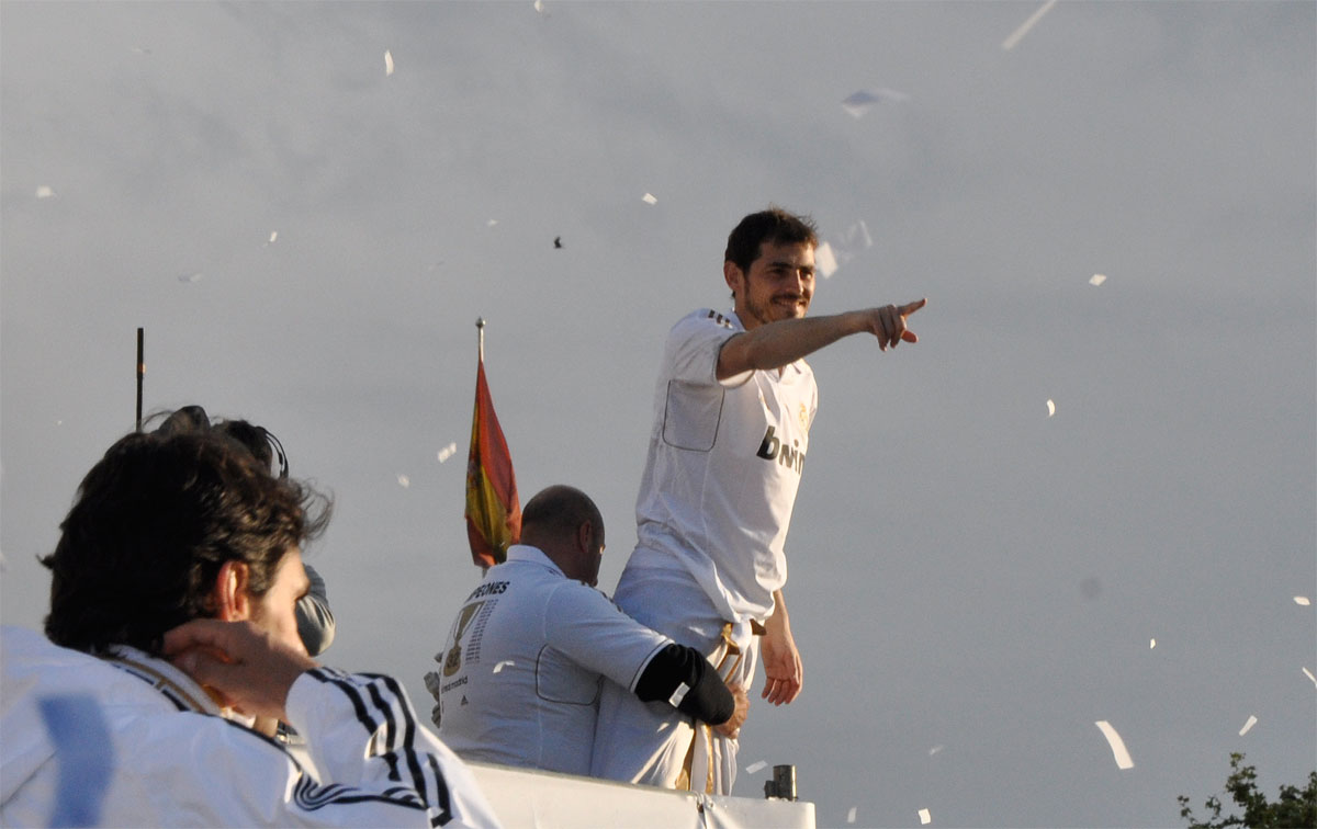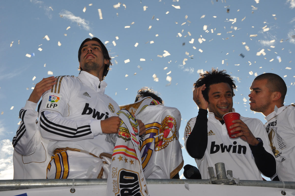Miles de personas reciben en la calle a los jugadores del Real Madrid tras hacerse con el título de Liga.