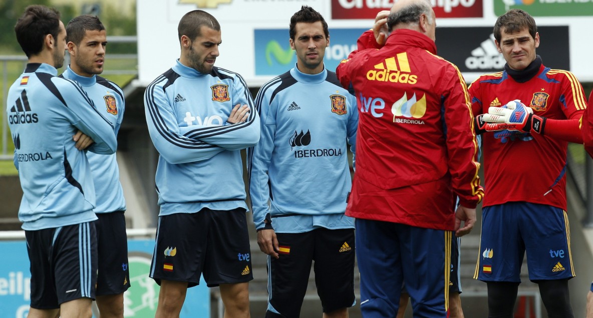 Ha amanecido diluviando sobre la pequeña localidad de Schruns pero la lluvia ha dado un respiro al grupo de internacionales en la hora de entrenamiento. El seleccionador Vicente Del Bosque ha estado muy activo, dando continuas órdenes, centrándose en los numerosos jugadores nuevos para inculcar las ideas de juego. Tras el calentamiento y los ejercicios en rondos de toque y presión, más un pequeño circuito físico, los 21 internacionales se han repartido en dos equipos en los que comenzaron las pruebas.