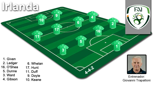 El centro destaca por su capacidad de sacrificio. Hunt es el auténtico líder; todocampista de esos que brillan en el fútbol inglés. Andrews o Whelan no brillan precisamente por su calidad, sino por su trabajo, su disciplina, y su inteligencia a la hora de saber qué es lo que necesita su equipo en cada momento. Y una de las primeras opciones es buscar la velocidad por las bandas, donde McGeady y sobre todo Damien Duff son dos auténticos puñales. Aunque el recelo defensivo de Trap puede hacer que uno de los dos –presumiblemente McGeady- deje su lugar para un centrocampista de modelo más táctico.