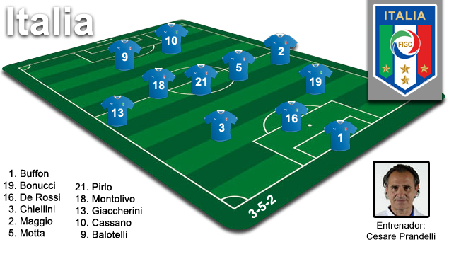 En el centro del campo Pirlo sigue siendo el jefe. El futbolista, que parece estar viviendo una segunda juventud desde que llegara a la Juventus el pasado verano, llevará el timón del equipo, acompañado, como suele ser habitual en los equipos de Prandelli, por dos guerreros. De Rossi debía ser uno de ellos, aunque si retrasa su posición a la defensa dejará su lugar a Thiago Motta.