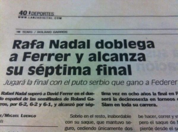 El pasado sábado, un día después de que Rafa Nadal lograra su pase a la final de Roland Garros tras ganar a David Ferrer, el diario manchego Lanza cometió un grave desliz.