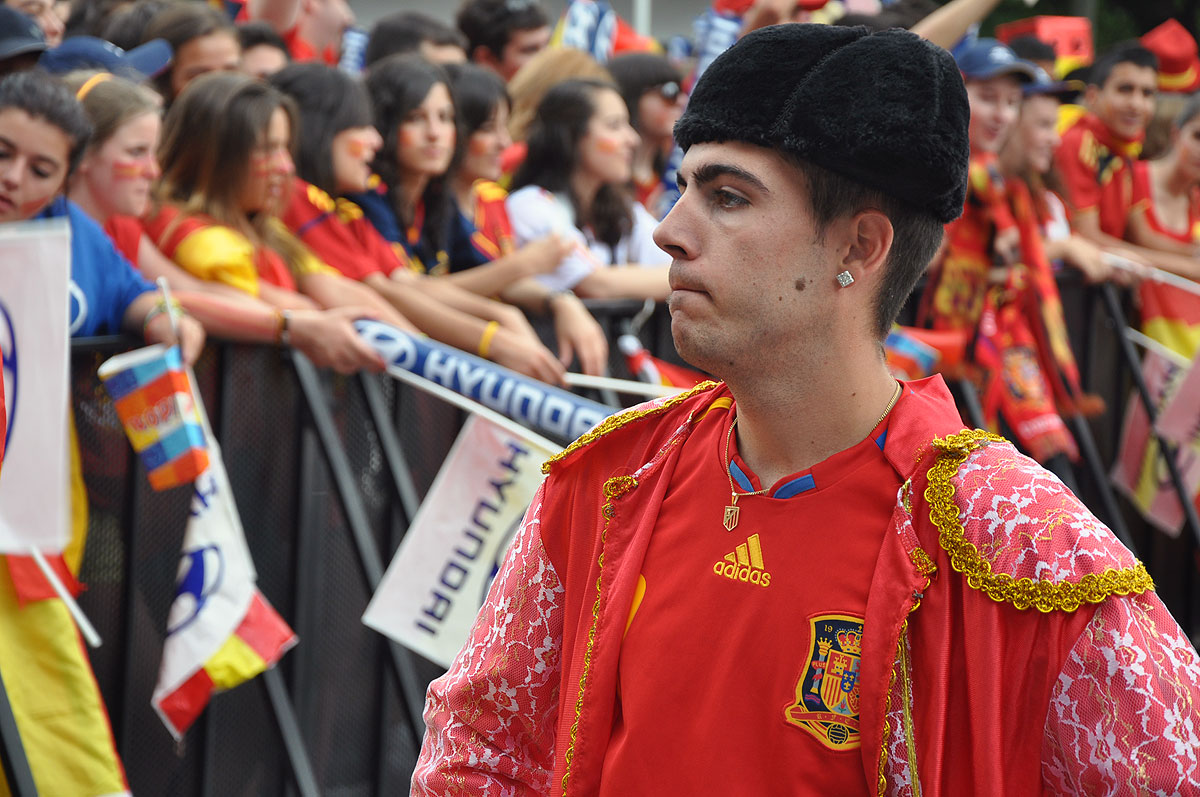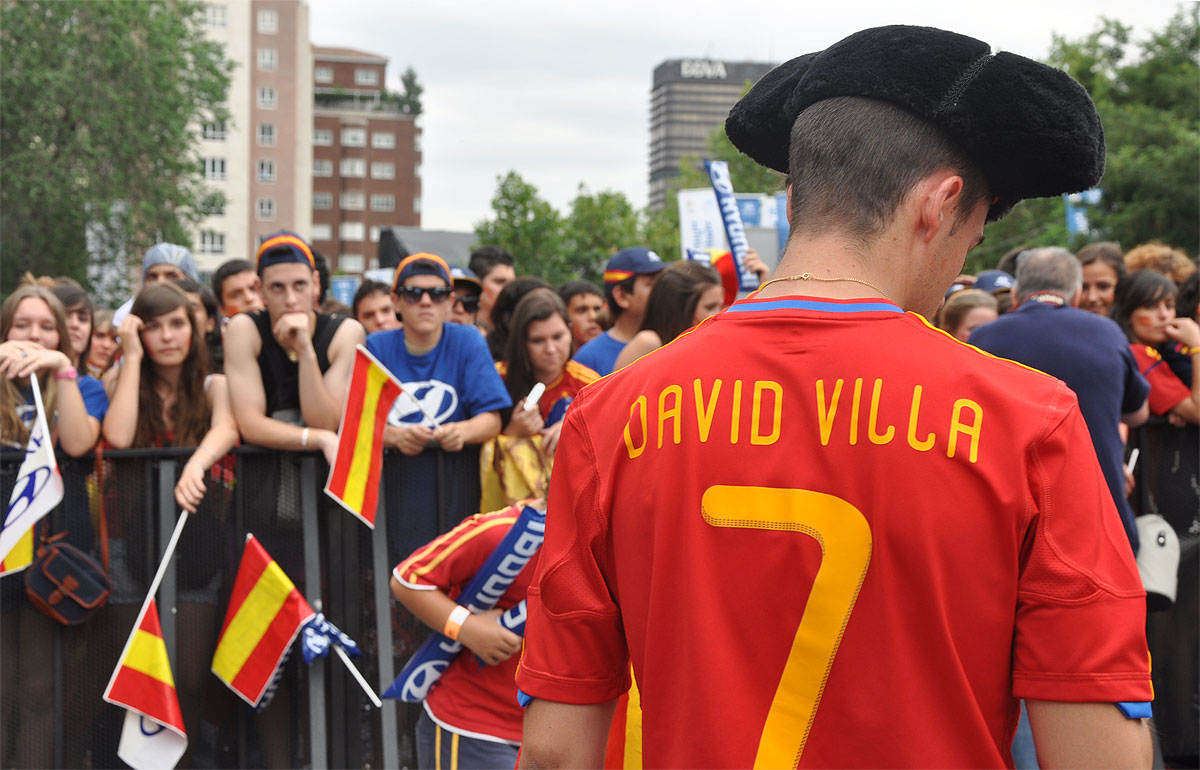 El delantero David Villa represntado en la camiseta de uno de os asistentes a la Fan Zone de Madrid.