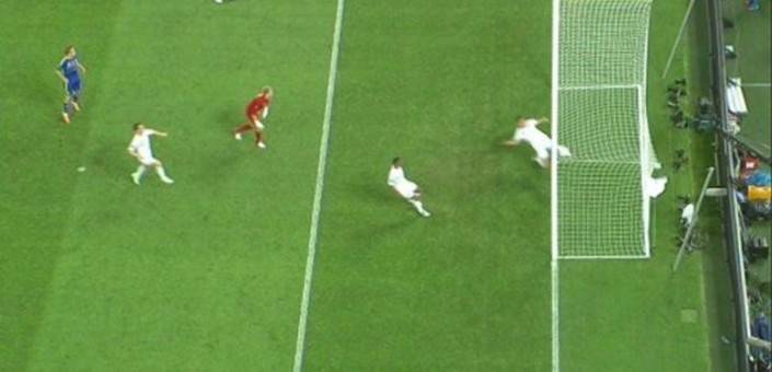 En el minuto 60 del partido entre Inglaterra y Ucrania, el delantero local Devic se plantaba solo ante Hart. El ucraniano levantó el balón por encima del portero, pero John Terry lo sacó prácticamente en la línea. Ni el juez de área, ni el de línea ni el árbitro principal, Viktor Kassai, dieron validez al tanto.