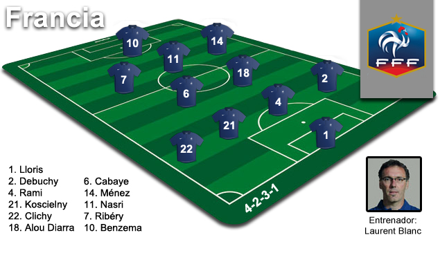 ¿Quiénes jugarán ante España? La lógica hace pensar en M’Vila, Cabaye y Menez algo más adelantado. Pero Blanc podría dar un paso atrás y colocar otro centrocampista de contención, Diarra, para tratar de contrarrestar el dominio español en la medular. Menez sería el sacrificado.