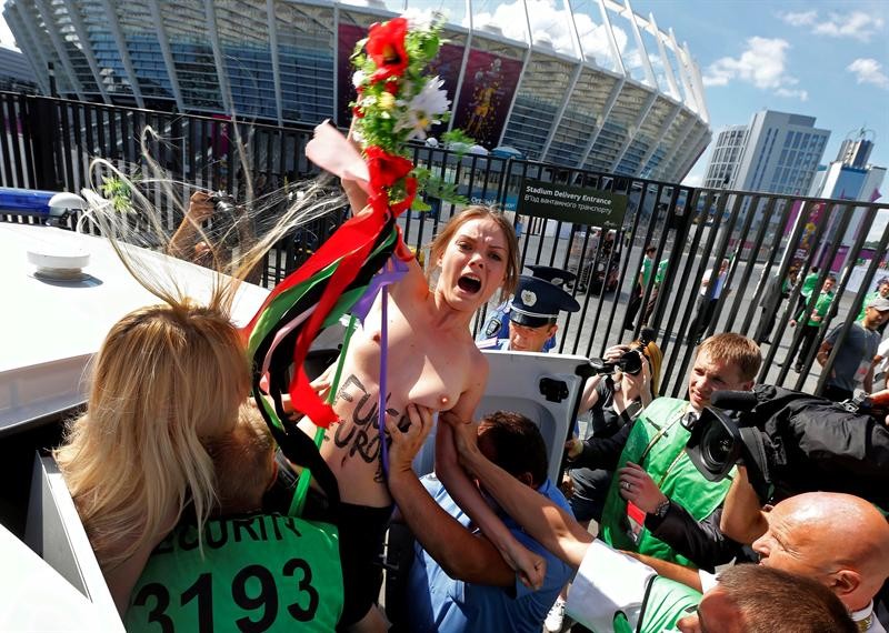Las activistas de FEMEN han tratado de impedir, desde el principio, la celebración del campeonato de fútbol, alegando que "promueve la prostitución, el alcoholismo y debilitamiento mental de la población".