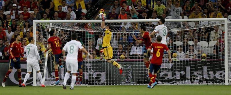 Las ocasiones llegaron con cuentagotas. La primera la tuvo Arbeloa, tras una buena jugada colectiva, con un remate desde la frontal que salió muy encima de la portería defendida por Rui Patrício (m.10). Poco más peligro pudo llevar España porque su rival supo frenarla en el medio campo, si bien Iniesta lo intentó con un remate lejano que se marchó al cielo ucraniano, ya a la media hora. Despertó enseguida la selección de las Quinas con Cristiano Ronaldo, el de siempre. El madridista inquietó a Casillas con un disparo desde fuera del área, tras aprovechar uno de los pocos errores defensivos en el partido de Jordi Alba, que salió desviado. Las ocasiones en el Donbass Arena, donde se registró mayoría de seguidores españoles, brillaban por su ausencia porque la auténtica batalla se libraba en el medio campo.
