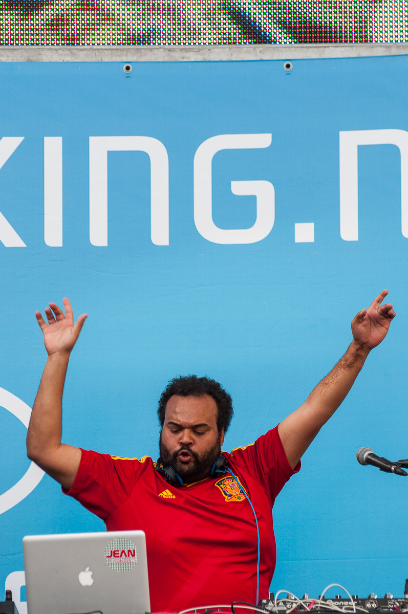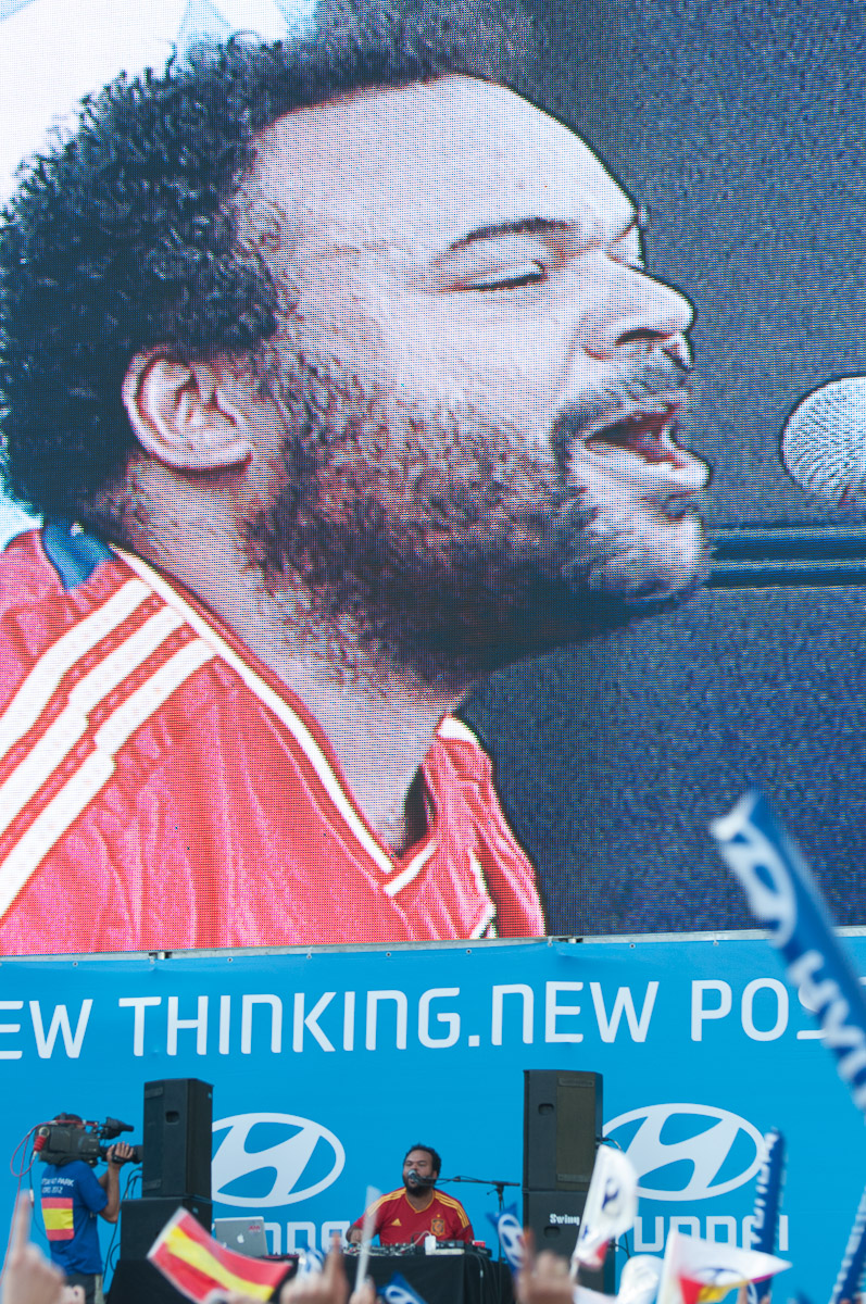 En la zona con pantallas gigantes junto al Bernabéu antes del partido amenizó el ambiente Carlos Jean como DJ