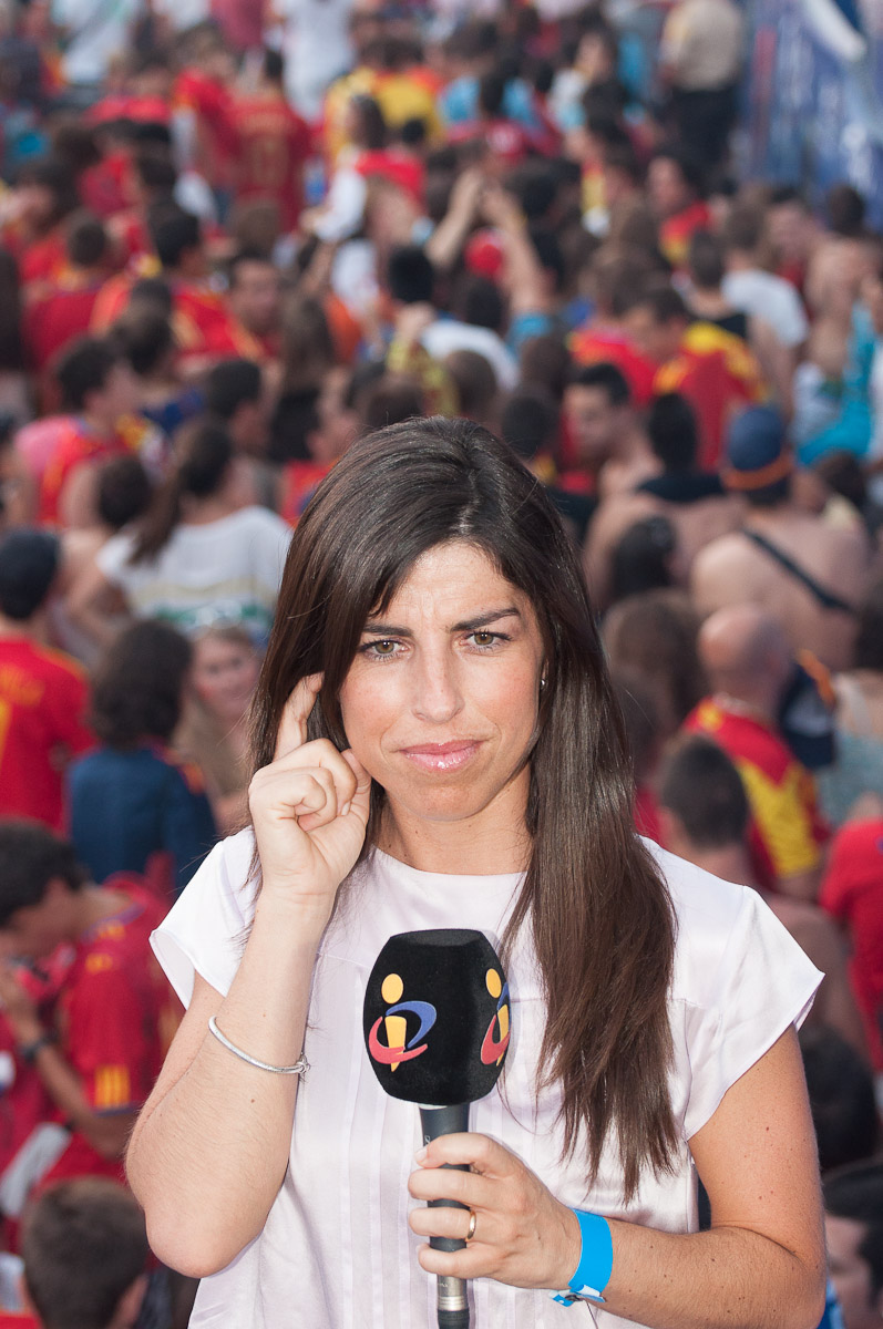 Una reportera intenta hacer una conexión en directo en mitad del estruendo del descanso
