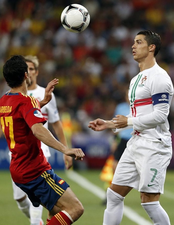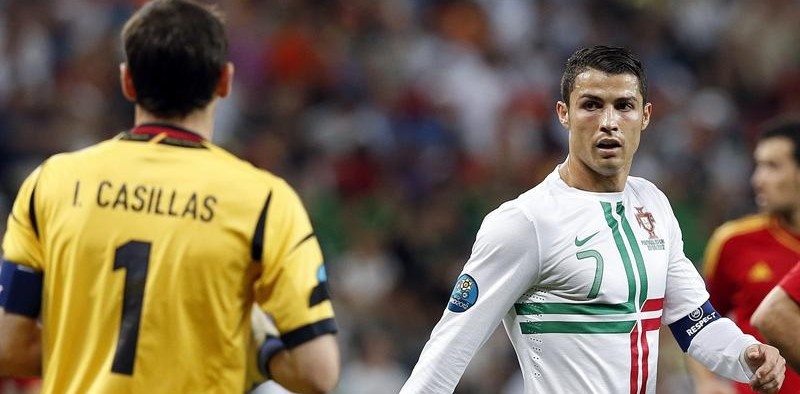 Iker ataja un córner lanzado por Portugal. El peligro de la selección lusa lo llevaba Cristiano Ronaldo constantemente en sus botas.