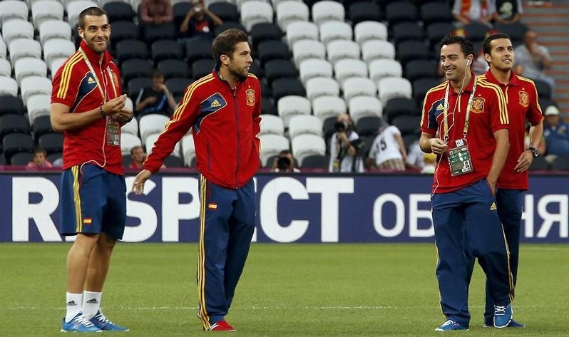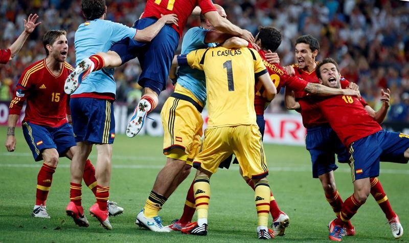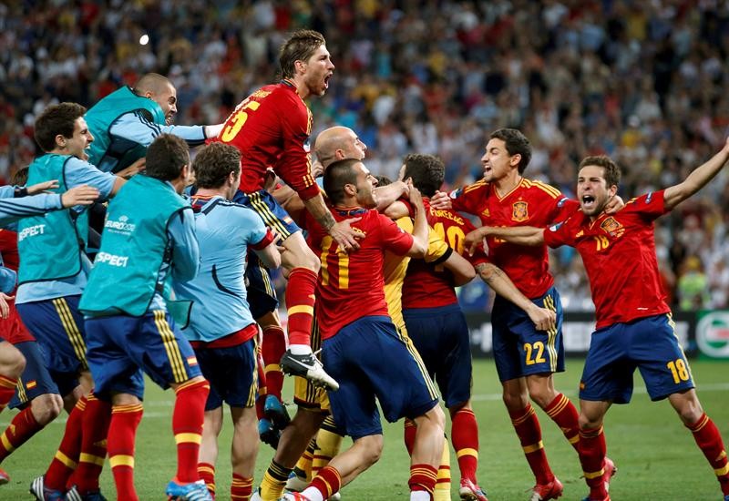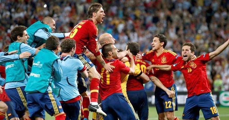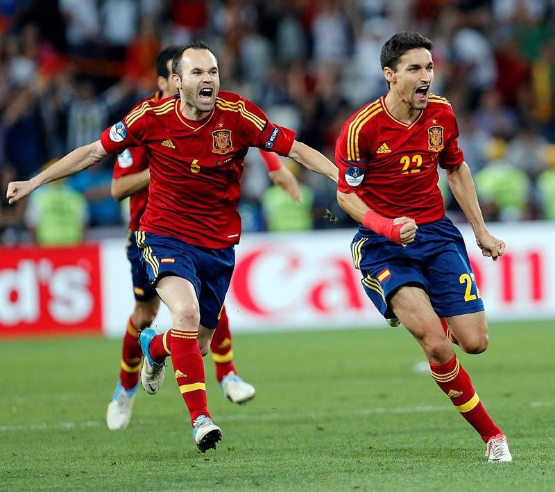 Iniesta y Navas celebran el penalti decisivo de Cesc que lleva a España a la final