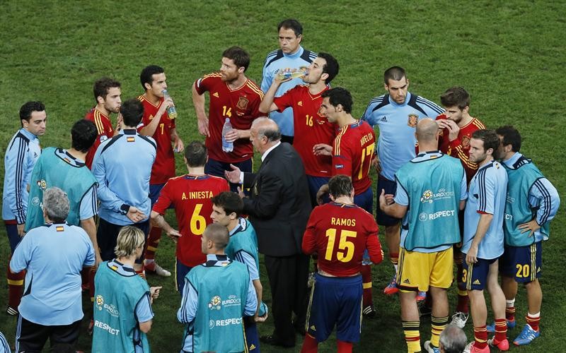 Los jugadores españoles se reúnen en torno a Del Bosque antes de la prórroga.
