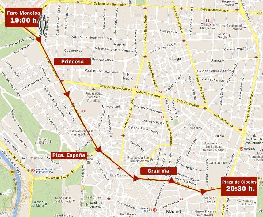 El desfile comenzará en Moncloa, y seguirá por la calle Princesa, Plaza de España, la Gran Vía y la calle de Alcalá. Sobre las 20:30 se espera la llegada de la selección a la Plaza de Cibeles, donde se instalará un escenario en homenaje a los tricampeones de Europa.