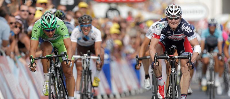 Greipel salió disparado en busca de su cuarta victoria en el Tour de Francia y Sagan se pegó a su rueda. Era el marcaje clave de la etapa, que se resolvió a favor del corredor de Rostock, récord de victorias en la temporada con 16.