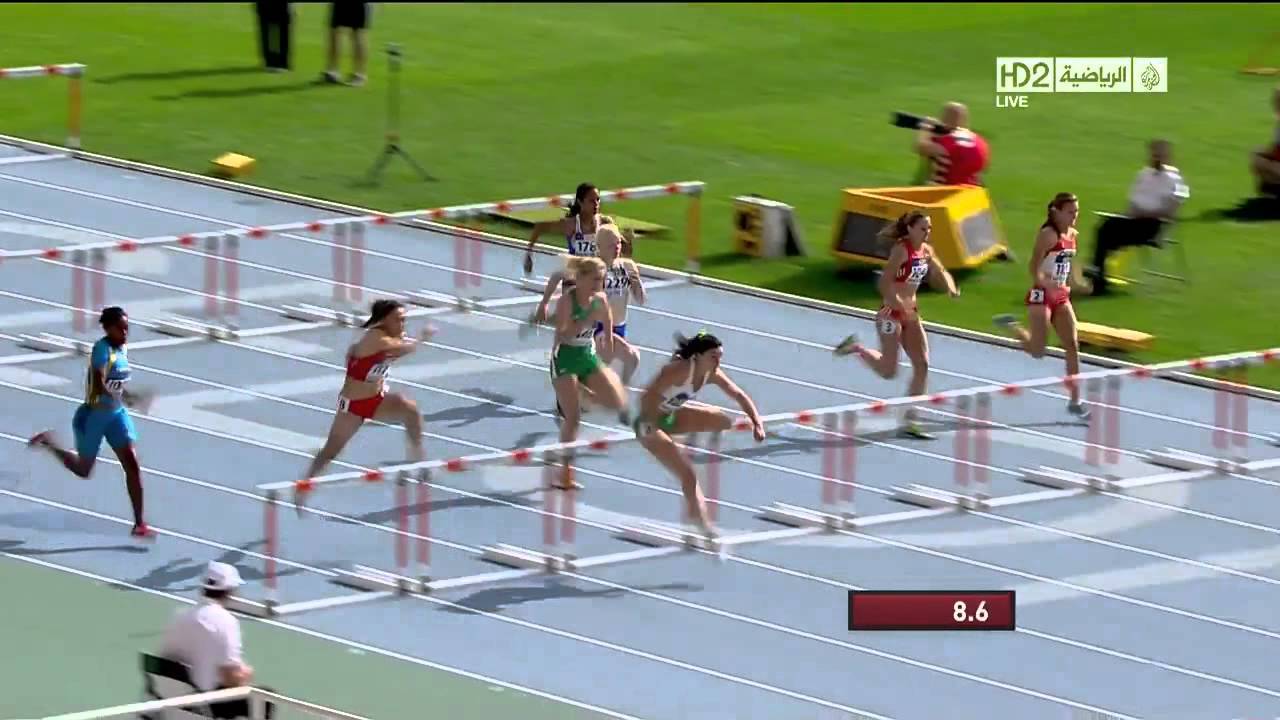 La atleta australiana Michelle Jenneke calienta antes de la carrera con un baile.