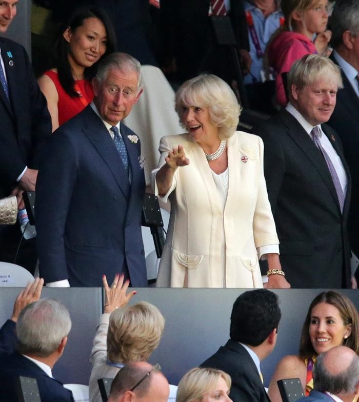 Carlos de Inglaterra y su esposa Camilla saludan a otros de los invitados.