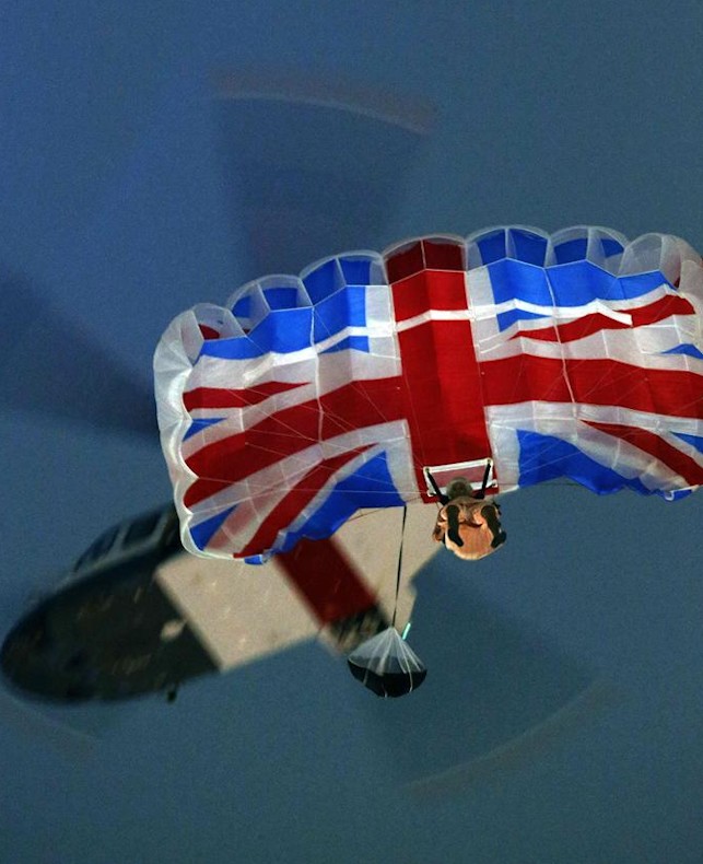 El humor también estuvo presente a lo largo de toda la ceremonia. En una parodia, la reina Isabel II se lanzó en paracaídas desde un helicóptero con la compañía de James Bond.