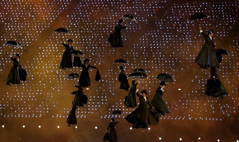 Rememorando la literatura y el cine británico, decenas de Mary Poppins sobrevolaron sobre el Estadio Olímpico londinense.