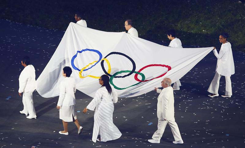 Ocho personalidades mundiales, con Gebreselassie a la cabeza, fueron las encargadas de transportar la bandera olímpica hasta el mástil.
