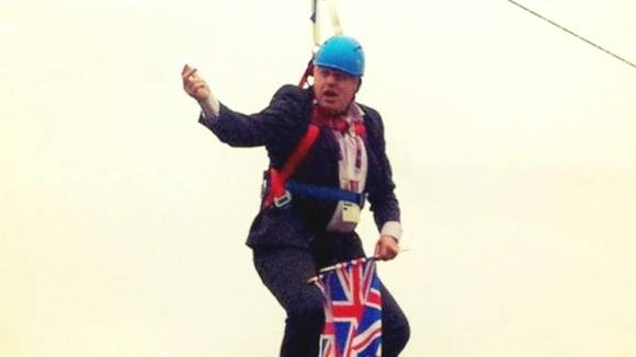 El alcalde de Londres, el conservador Boris Johnson, se quedó colgado del cable de una tirolina en el parque londinense de Victoria Park y fue rescatado con una cuerda tras cinco minutos en el aire.