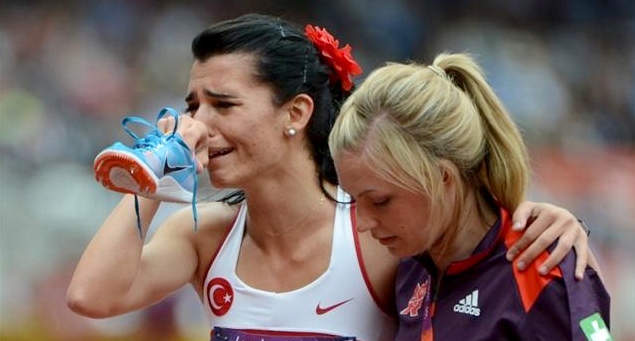 Durante la segunda serie de la primera ronda clasificatoria de los 800 metros femeninos, la turca se lesionó cuando lideraba la carrera por delante de las dos favoritas, la rusa Mariya Savinova –a la postre vencedora– y de la estadounidense Alice Schmidt.