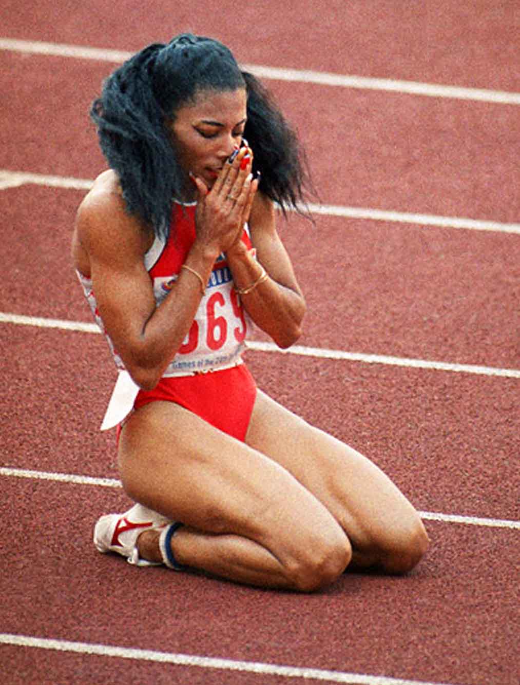 Florence Griffith-Joyner - 10,62 s - Seúl 88 En su mejor momento deportivo, Griffith - Joyner arrasó en los juegos de Seúl logrando tres oros, una plata y varios récords. Sin embargo, ya entonces las sospechas de dopaje se cernían sobre ella y su temprana muerte con menos de 40 años no hizo sino acrecentarlas. En la imagen, en un podio en Seúl