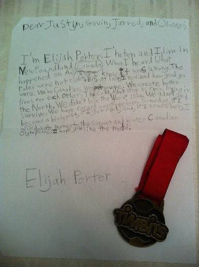 "Queridos Justin, Gavin, Jarred y Oluseyi. Soy Elijah Porter. Tengo diez años y vivo en Terranova, Canadá. Cuando me enteré de lo que sucedió el 11 de agosto, estuve mal. Las reglas no estaban en lo cierto, pero al menos me di cuenta de lo bueno que erais. Nosotros somos canadienses. Perseveramos. Mejoramos las vidas de los demás. El frío no nos impide vivir en el norte. No perdimos la guerra. Nos adaptamos y sobrevivimos. Nos hemos ganado nuestra propia libertad. Algún día, si me convierto en un biólogo, si me hago rico, y si me acuerdo, voy a donar dinero para los deportistas olímpicos de verano y los de invierno. Espero que os guste la medalla".