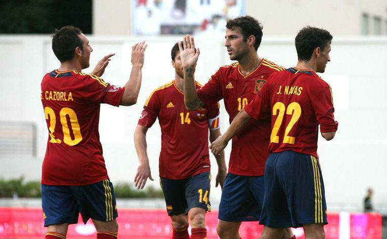 Entre el flamante fichaje del Arsenal y Cesc Fábregas llevaron peligro constante al marco contrario. También Navas gozó de una buena ocasión para haber marcado. Estaba claro que el 0-1 iba a caer tarde o temprano. Costó abrir la lata, pero España se encontró con dos goles en apenas tres minutos. En la recta final de una primera parte con un solo dominador. A los 42, Cazorla sorprendió a Gaudette con una pizca de fortuna y en el 45, Cesc fusiló al portero tras enganchar de primeras un preciso centro de Navas hacia atrás. Con el 0-2 se iba España al descanso.