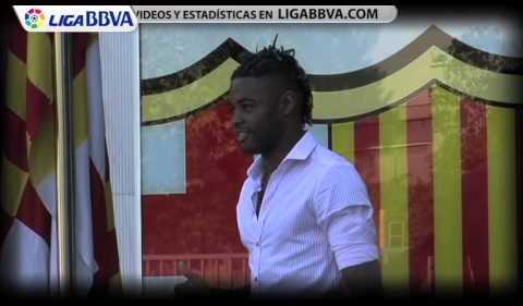 Alexandre Song ya está en Barcelona y este lunes por la mañana ha posado en la puerta de las oficinas del club, antes de pasar la revisión médica. Por la tarde, firmará su contrato y será presentado por Sandro Rosell como nuevo jugador del Barça.