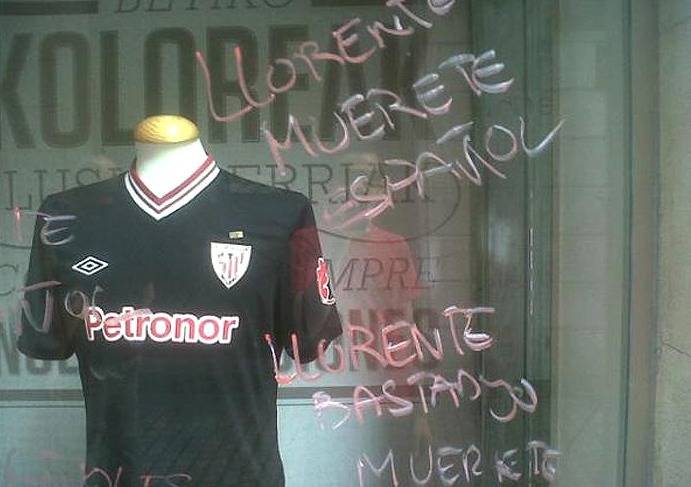 Unas pintadas en contra de Fernando Llorente han aparecido este domingo en una tienda oficial del Athletic Club en Bilbao, donde el equipo rojiblanco ha perdido ante el Real Betis en San Mamés (3-5). Ha sido en la tienda oficial del club rojiblanco en el Casco Viejo bilbaíno, donde alguien ha escrito "Llorente muérete español" y "Llorente bastardo muérete".