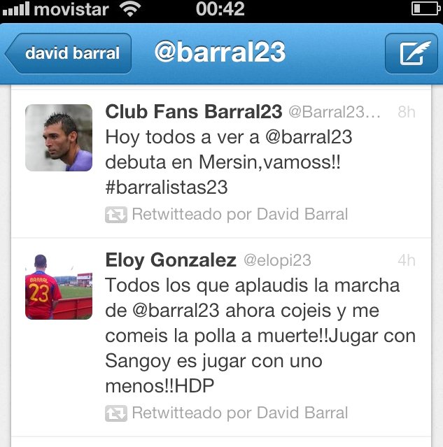 El delantero gaditano, que ahora milita en el Orduspor turco, reprodujo el mensaje del usuario @elopi23 en el que se menospreciaba la actuación de Gastón Sangoy en Los Parajaritos: "Todos los que aplaudís la marcha de @barral23 –la cuenta en Twitter de David Barral–, ahora cogéis y me coméis la polla a muerte! Jugar con Sangoy es jugar con uno menos! HDP", escribió el seguidor sportinguista.